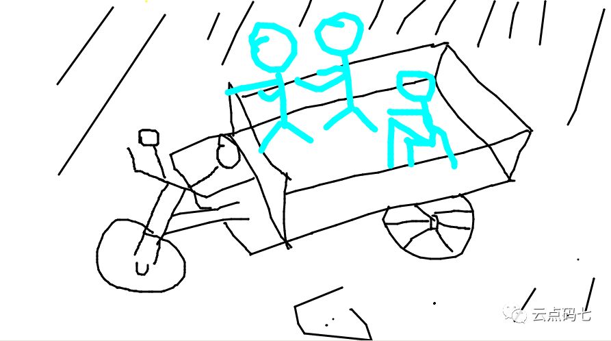 风雨知秋之进城三人,至此才说到了我和大志远两个人,还有个人是个妹子(老萍),是大志远的小师妹(也是个前端,广西桂林的)。她的经历也比较扎心(后面我也会陆续说到),她是在我和大志远来北京了快一个月的时候来的,来的第一天,我们帮助她找到了一个住的地方。房租500每个月,距离我和大志远住的地方很近,毕竟一个女生很不容易,那天我们三个人一起去帮她买了被褥、电扇等生活用品。我记得买东西的那家店老板也是安徽人,很客气,开了他的三轮车帮我们把东西送回去,路上还下起了大暴雨,三个人站在三轮车的后车厢里,也没个雨衣,从头到脚淋的透湿。(大概就是如下图的场景,原谅七哥这个灵魂画手,哈哈哈)