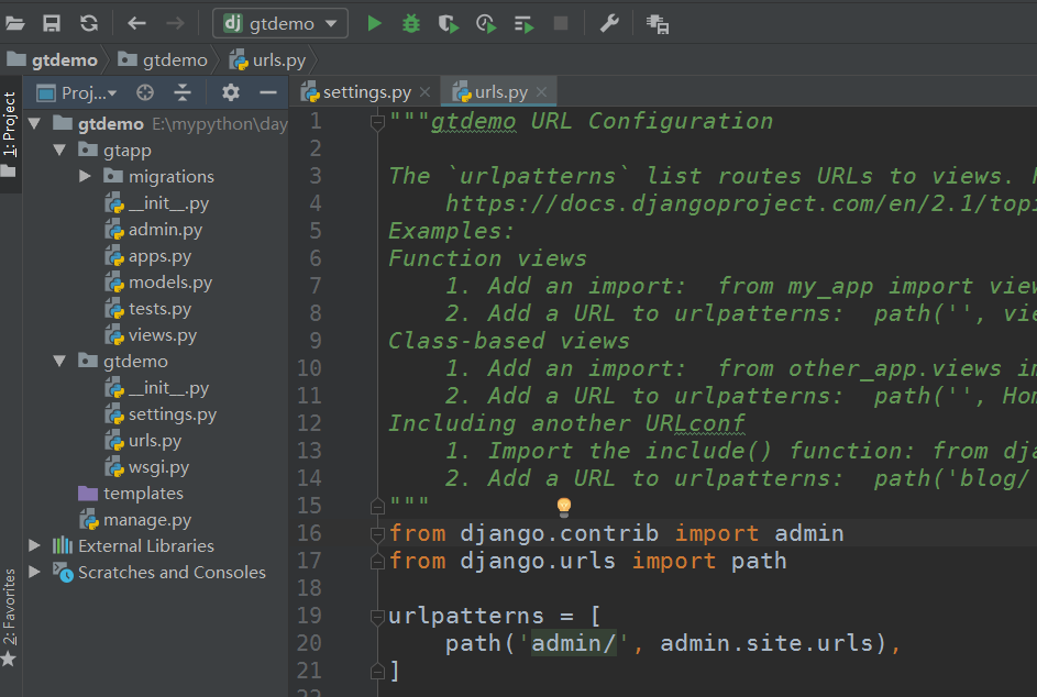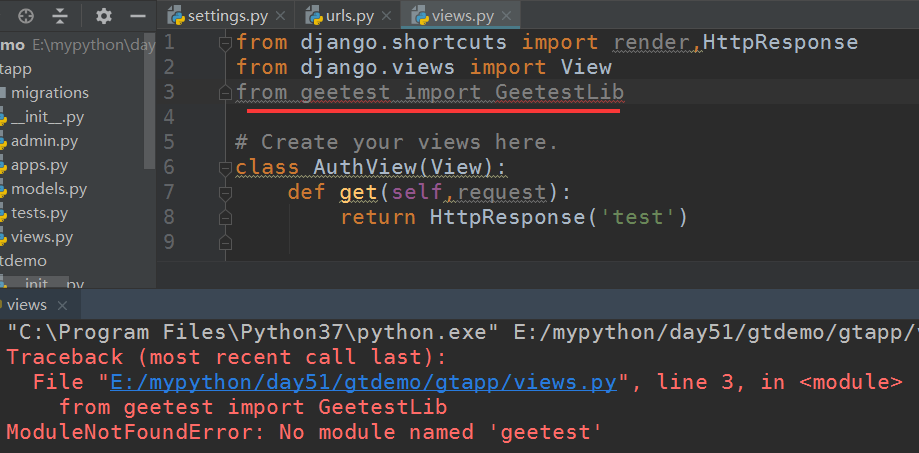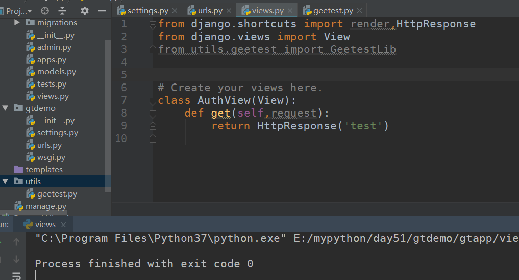由极验的官方文档可知,极验支持Python的django ,flask,Tornado 三个框架,这里我使用django简单创建一个示例看是否安装成功,项目名为gtdemo,app名为gtapp: