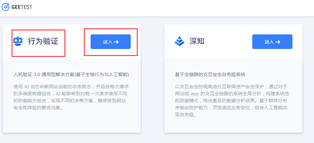 注册完账号之后登陆极验的后台,这些步骤不用展示了,电脑常识就不啰嗦了,登陆之后选行为验证:
