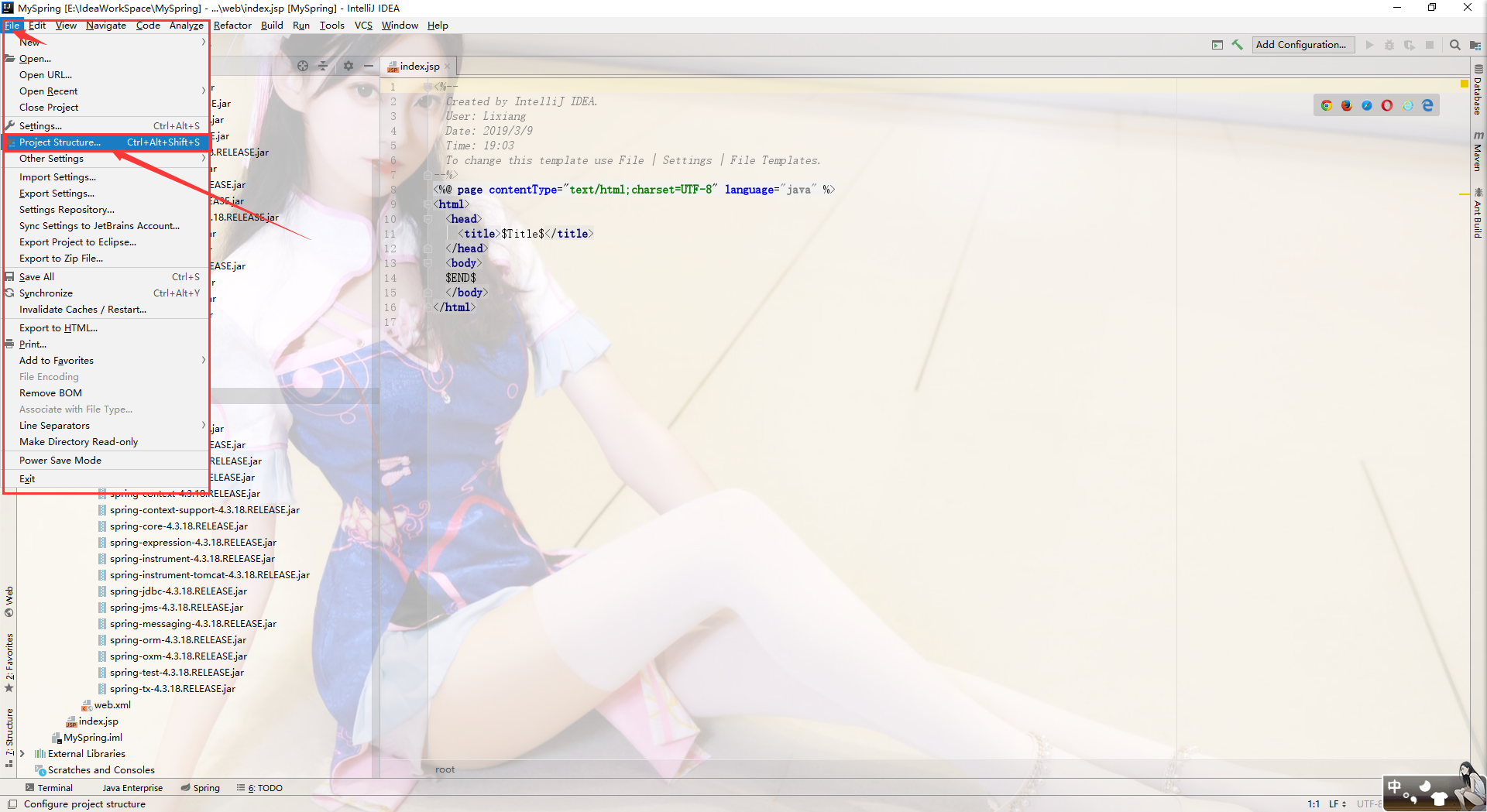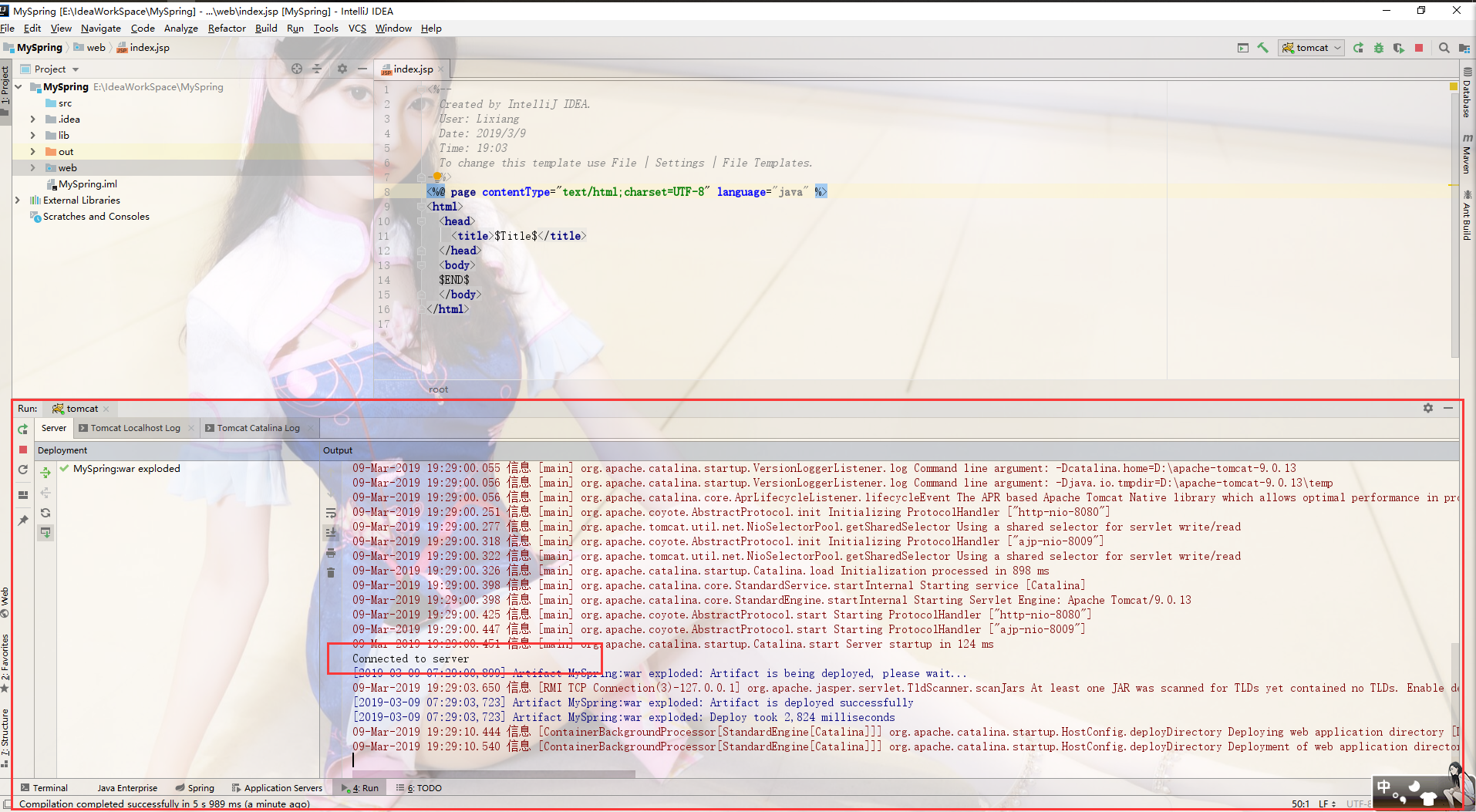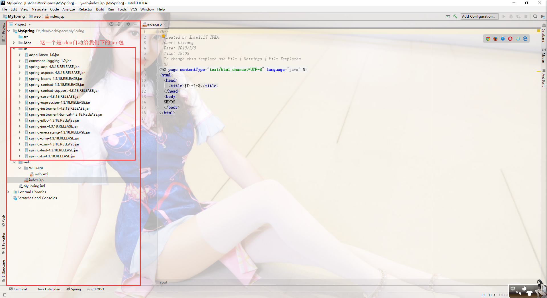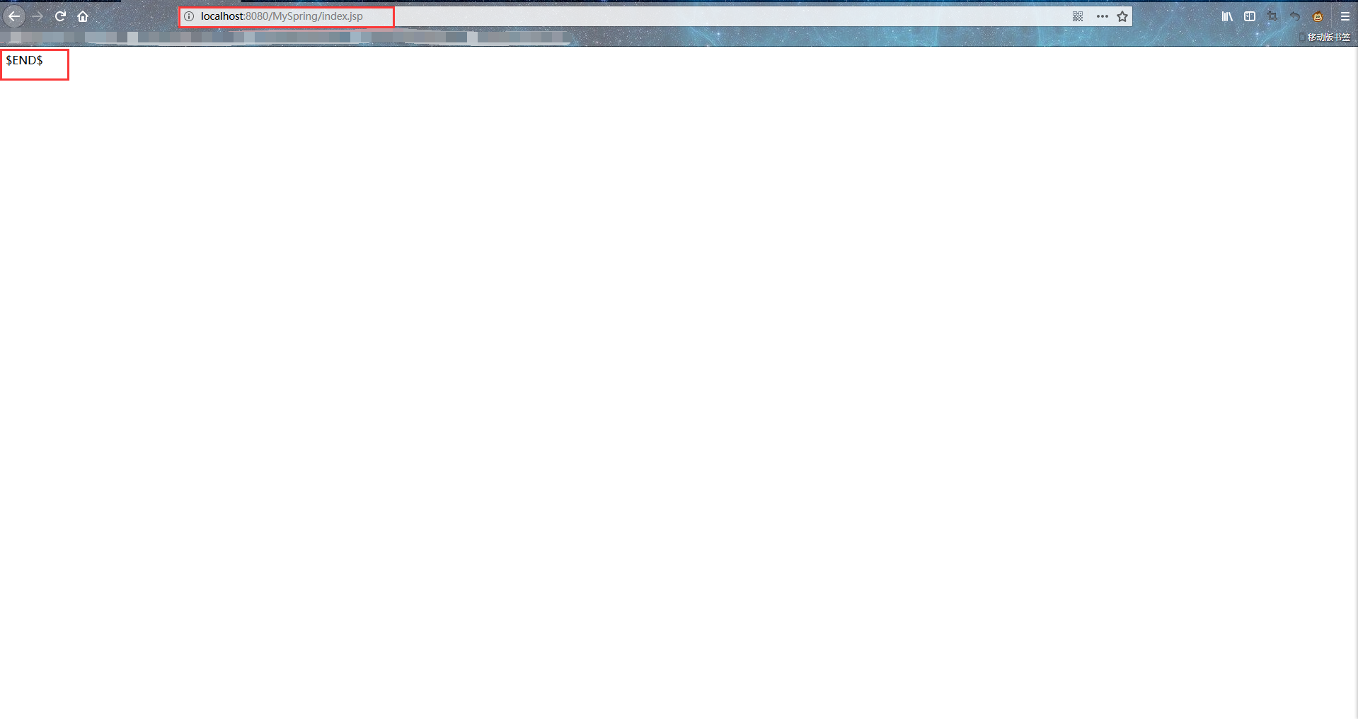 打开浏览器 输入localhost:8080/MySpring/index.jsp,出现以下内容说明第一个Spring项目完成了,其中MySpring是之前需要记住的项目名。