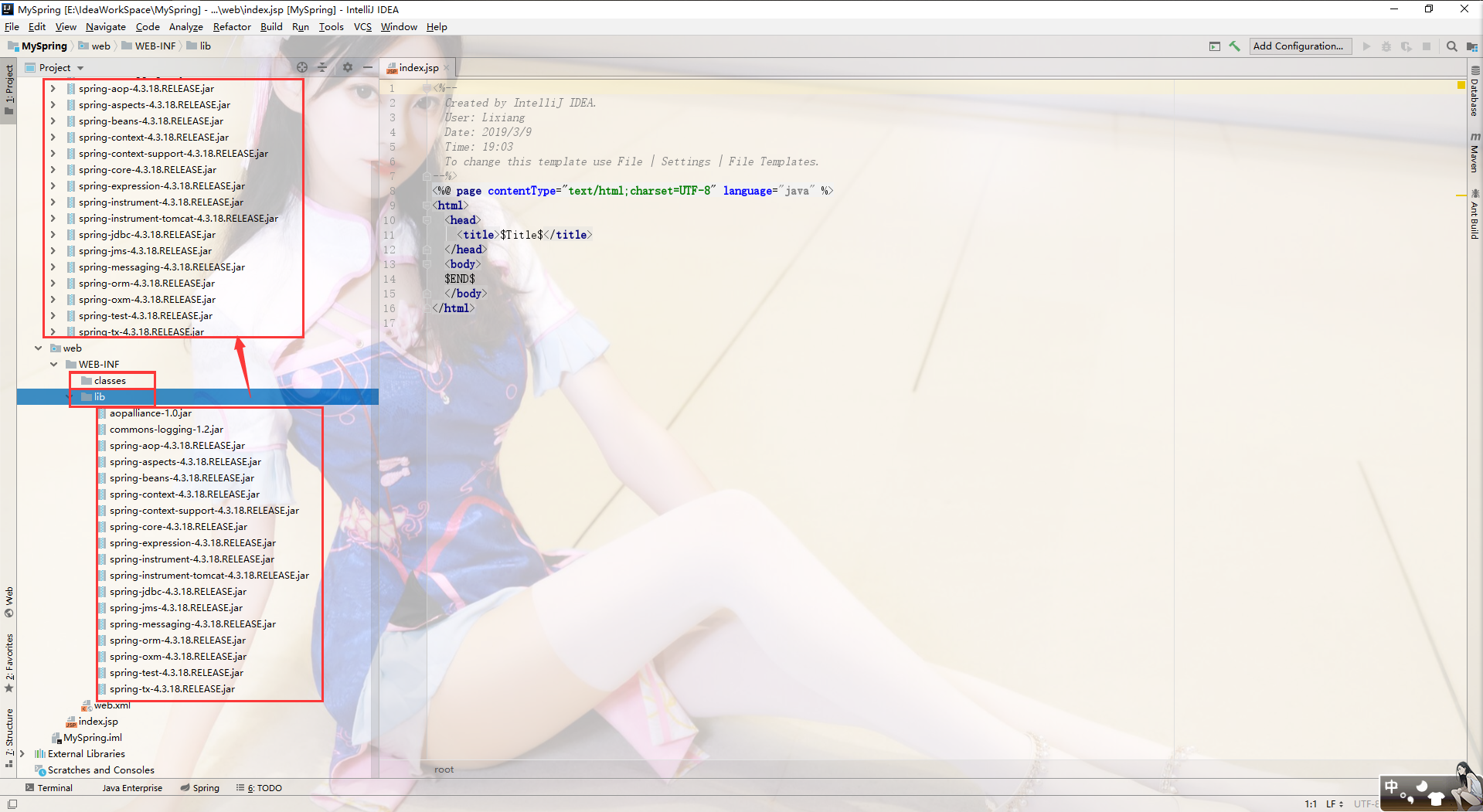 同样,我们在WEB-INF/目录下创建两文件夹,classes,lib然后将上边lib文件夹中的jar包全部复制过来。