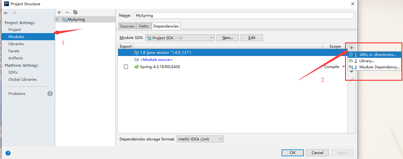 点击左边的Modules,然后选择中间的Dependencies选项卡,点击右边的加号,选择第一个 JARs or directories...,