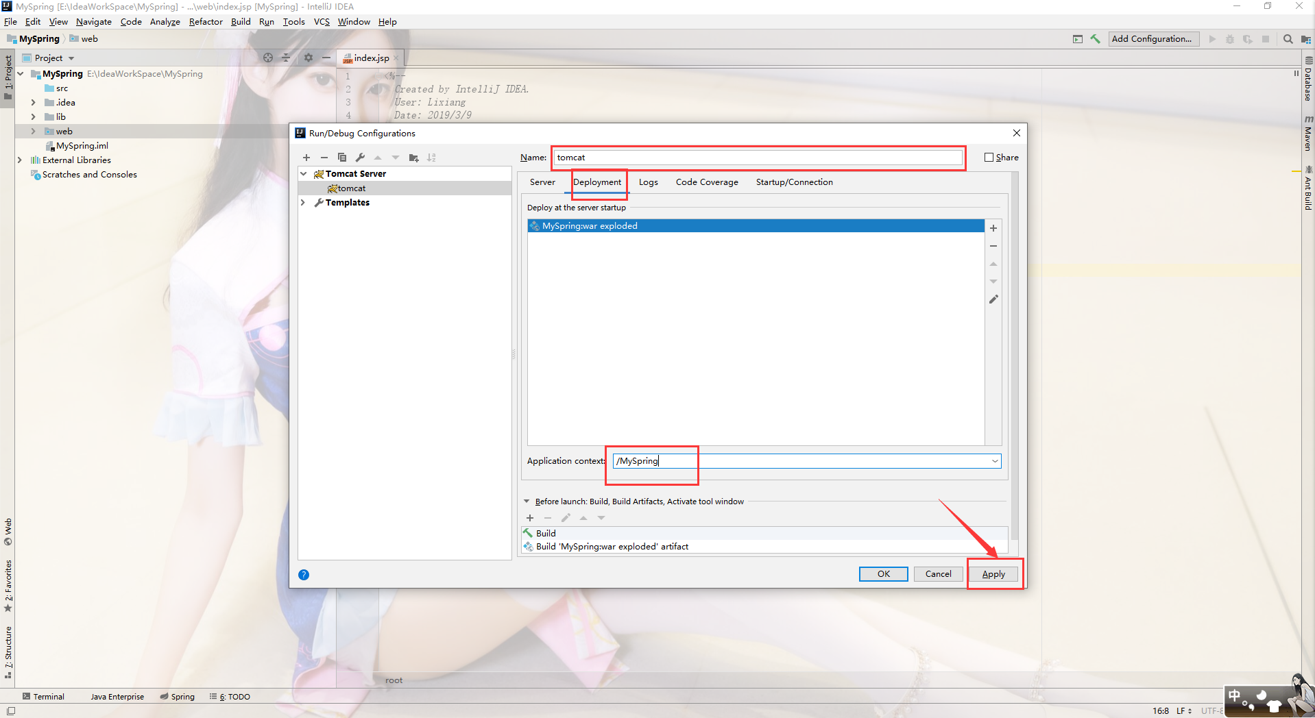 先选择第二个选项卡,将Name随便改,点击右边的 + 号--->Artifact 将下放输入框中的名改下,后面在浏览器中输入地址栏要用*********记住,点击apply