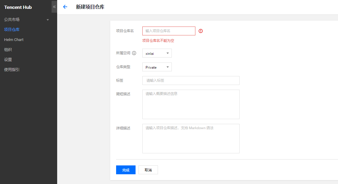 在开始之前,我们需要在Tencent Hub上创建一个项目仓库,如下图所示: