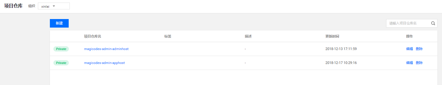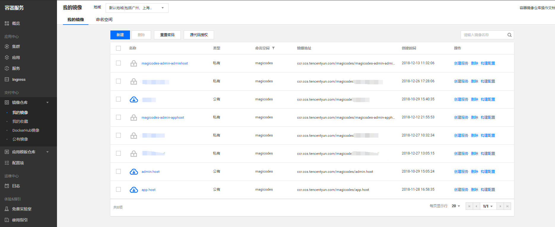 虽然我们已经创建Tencent Hub的镜像仓库,但是为了方便,笔者建议大家还创建腾讯云容器服务的镜像仓库,以便使用默认的触发器来触发服务更新。相比使用工作流来实现,更加稳定和易于维护。腾讯云容器服务镜像仓库界面如下所示: