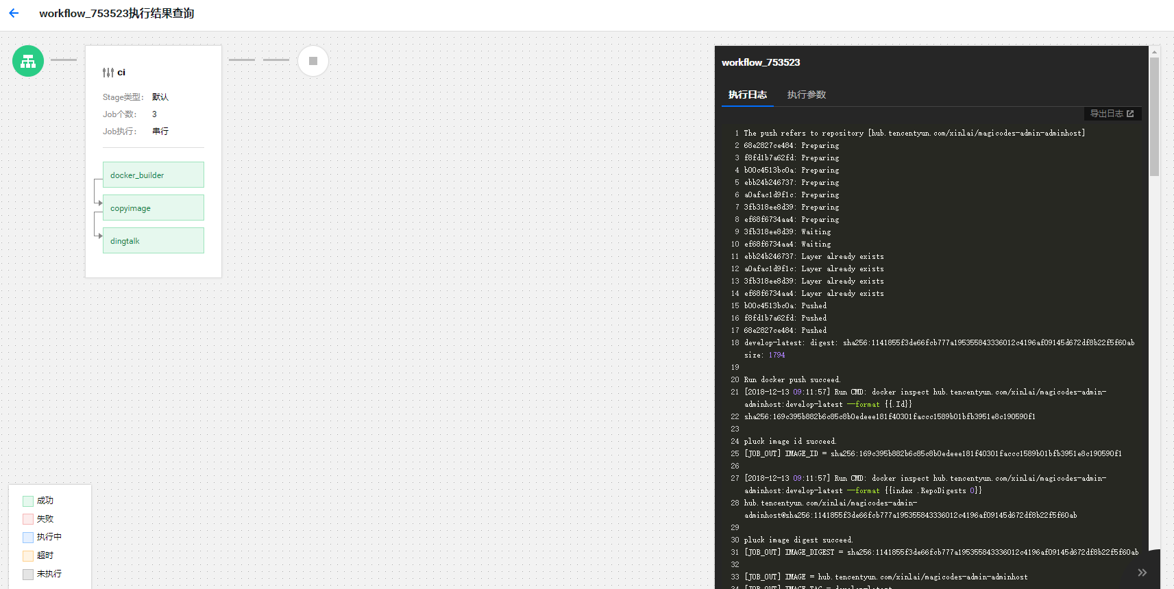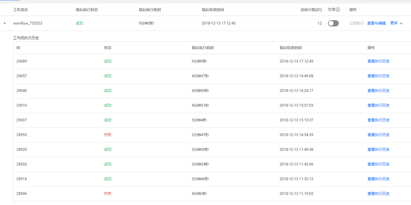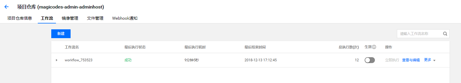 当代码提交时,就会自动触发构建,我们在工作流界面可以看到当前状态以及执行历史: