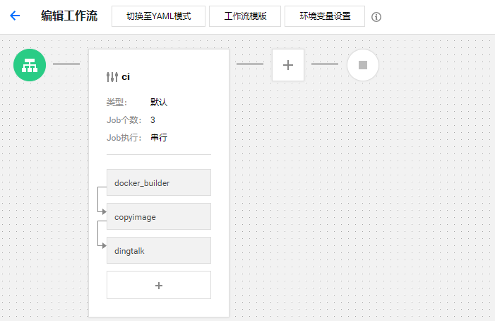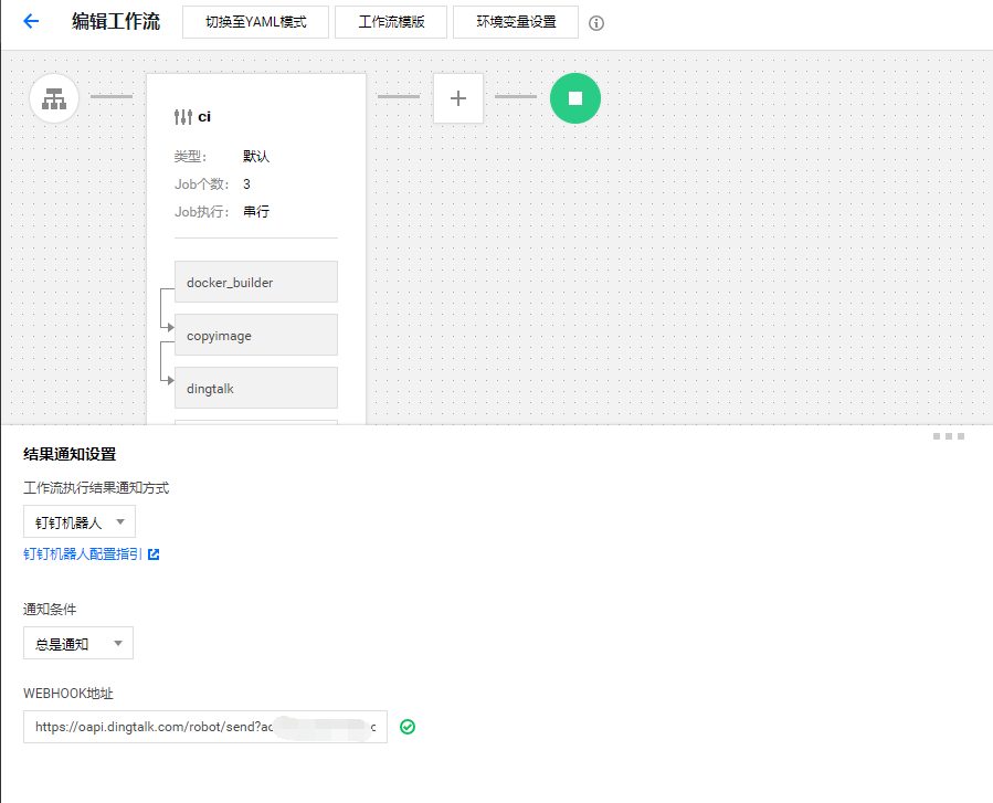 至此,整个工作流就配置完成了。当然,我们也可以在工作流的结束节点添加webhook通知,只是没法设置消息模板,如下所示: