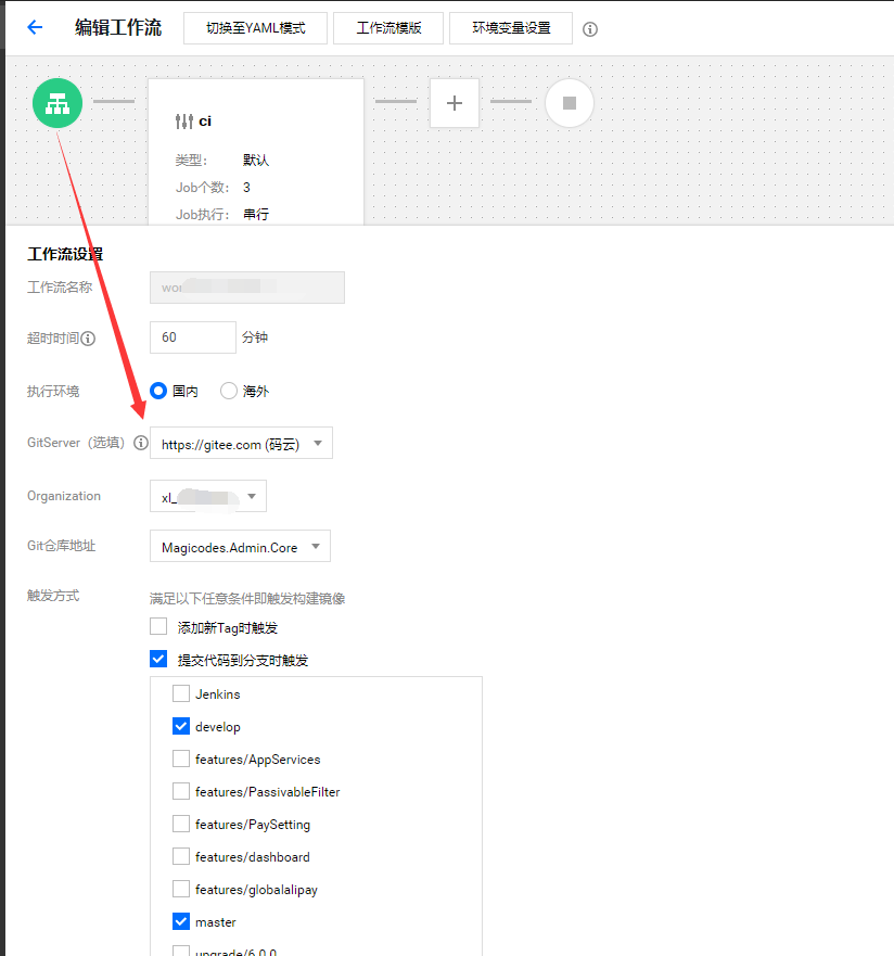 这里,我们勾选develop和master分支推送时触发工作流。