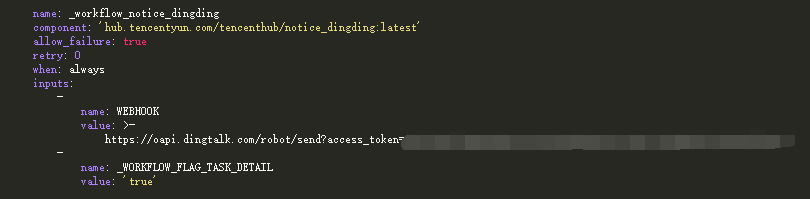 镜像复制完成,我们希望能够在相关的开发组、运维组接收到消息。Tencent Hub这边也有成熟的轮子——hub.tencentyun.com/tencenthub/notice_dingding。具体如下所示: