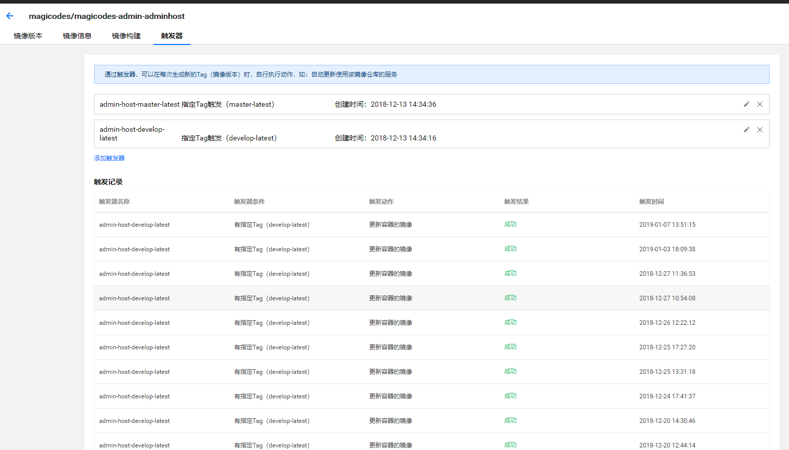 注意:我们可以通过不同的标签触发不同的服务更新,比如develop代表开发环境,master代表正式环境。