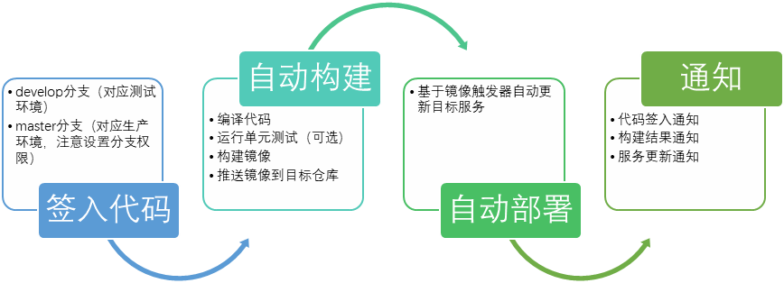 本流程仅作参考,后续笔者会独立一篇来讲解整个DevOps流程,以及项目(产品)渠道消息集成这块,这里仅作抛砖引玉,同时大家也可以更易于理解,容器技术大大简化CI、CD流程!