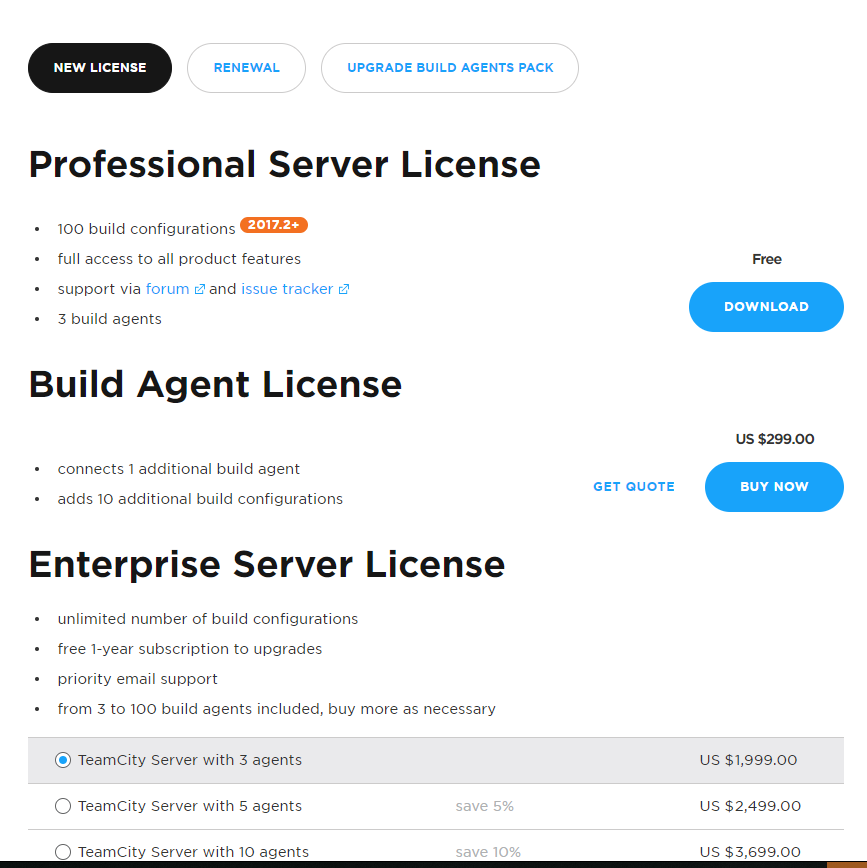 TeamCity在它的免费版本中提供了所有功能,但仅限于20个配置和3个构建代理。额外的构建代理和构建配置需要购买,你可以在这里找到价格。