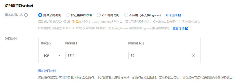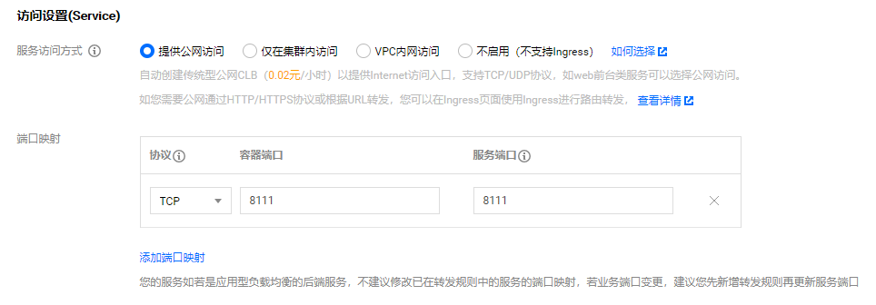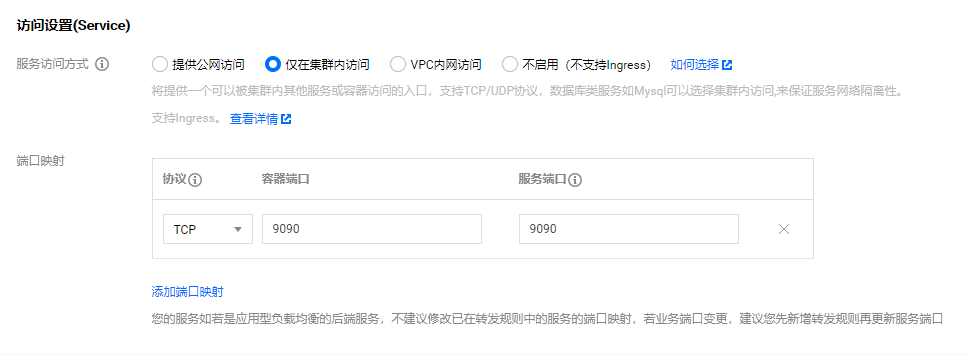 这里我们无需提供公网访问,因此选择【仅在集群内访问】即可。端口映射这块,Agent的默认端口为9090。