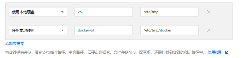 · 本地硬盘:将容器所在宿主机的文件目录挂载到容器的指定路径中(对应Kubernetes的HostPath), 也可以不填写源路径(对应Kubernetes的EmptyDir),不填写时将分配主机的临时目录挂载到容器的挂载点,指定源路径的本地硬盘数据卷适用于将数据持久化存储到容器所在宿主机,EmptyDir适用于容器的临时存储。