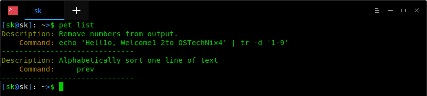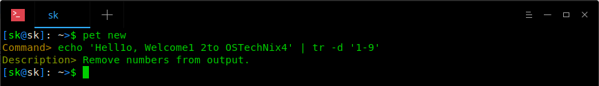 $ pet new -tCommand> echo 'Hell1o, Welcome1 2to OSTechNix4' | tr -d '1-9Description> Remove numbers from output.Tag> tr command examples