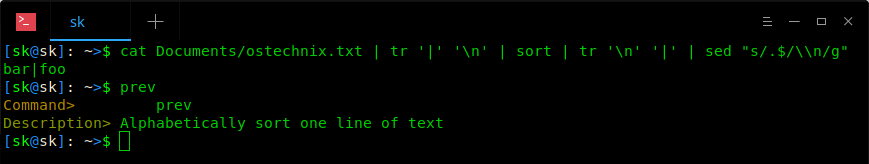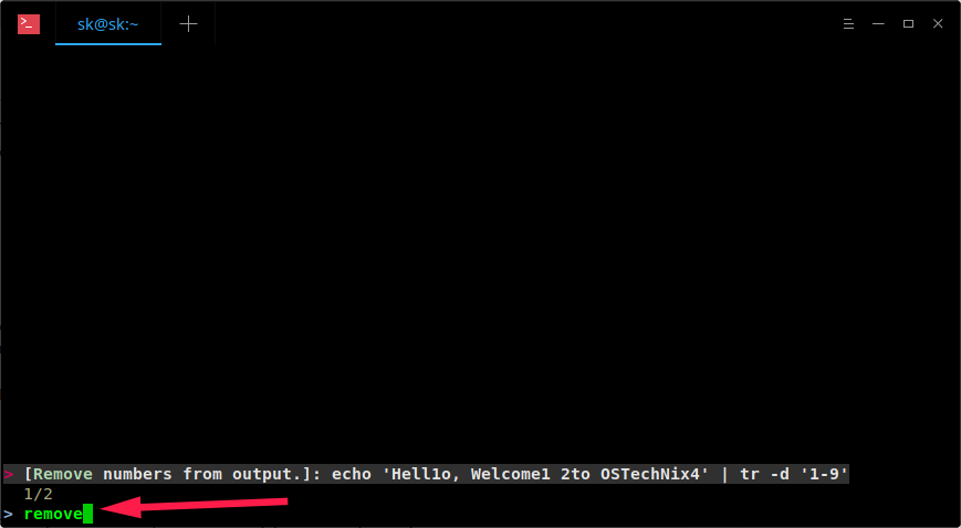 [[snippets]] description = "Remove numbers from output." command = "echo 'Hell1o, Welcome1 2to OSTechNix4' | tr -d '1-9'" output = ""[[snippets]] description = "Alphabetically sort one line of text" command = "\t prev" output = ""