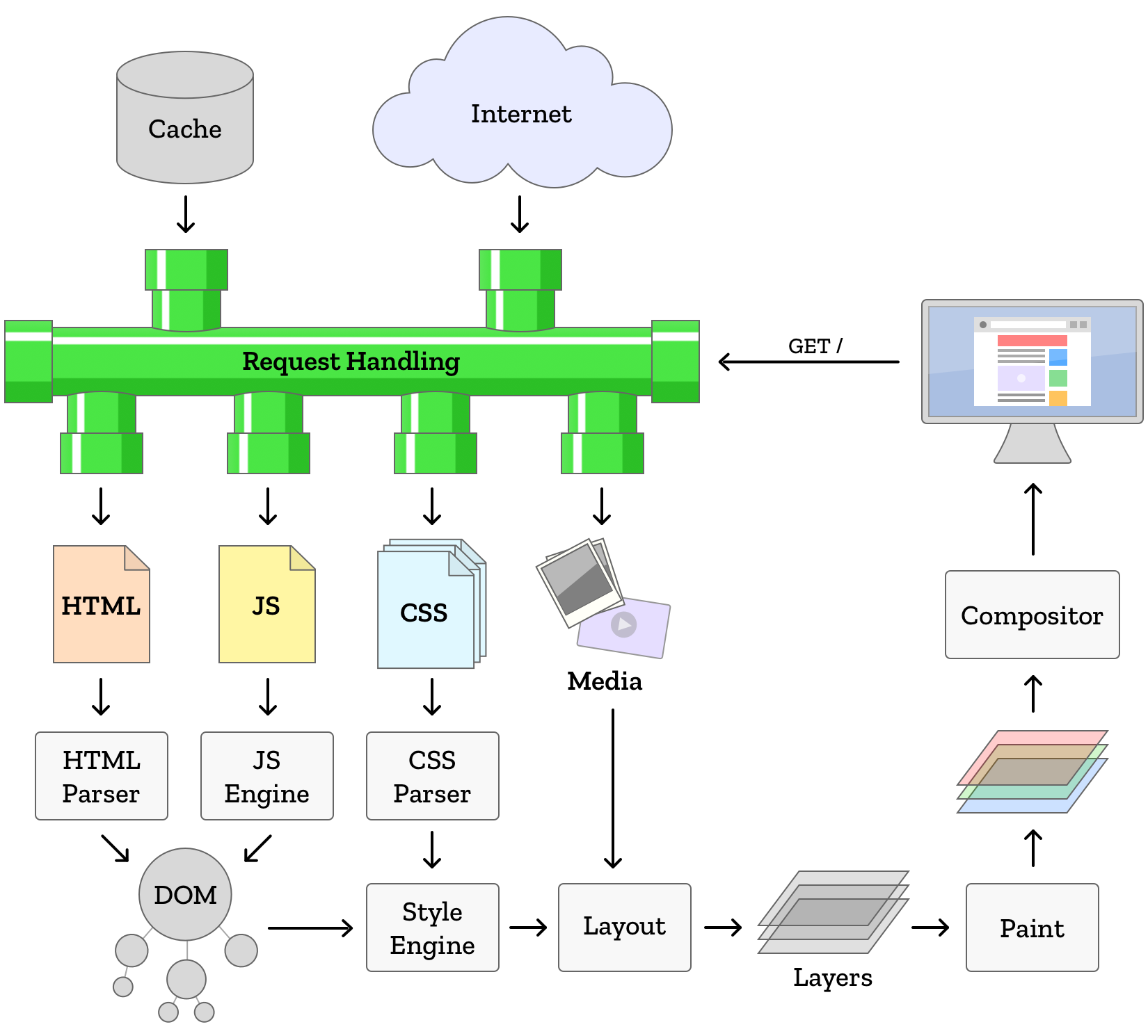 浏览器引擎将结构和样式组合在一起,用于在屏幕上绘制页面,并找出它的哪些地方是可交互的。