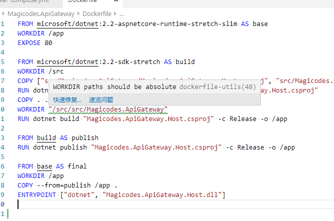 Dockerfile文件的语法检查和分析,会提示警告或错误;