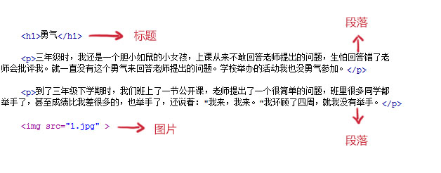 “勇气”是网页内容文章的标题,<hx></hx>就是标题标签 (x为1-6),它在网页上的代码写成<h1>勇气</h1>。