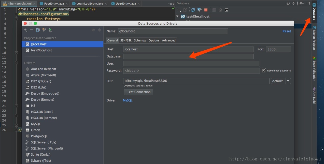 <property name = "connection.url">jdbc:mysql://localhost/test</property>