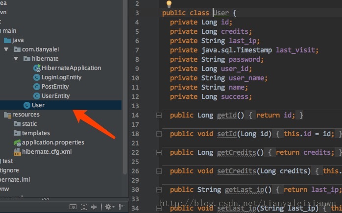 可以看到生成类很粗糙,就是把列名复制,完全照搬,我们希望的更格式化的pojo类,所以我们要使用hibernate来反向生成。