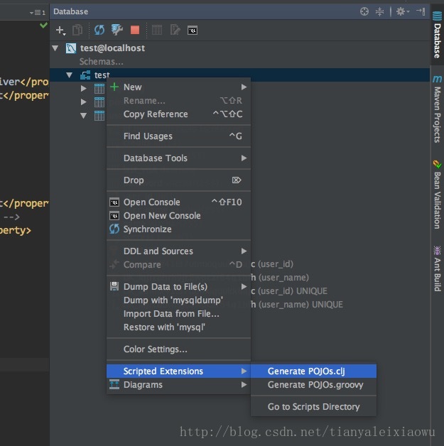 此时就可以生成简单的pojo类了,注意,此时还没有使用hibernate呢,就是idea的这个Database功能就可以生成pojo类了,只不过无格式。在界面上数据库名右键,出来下面的界面。
