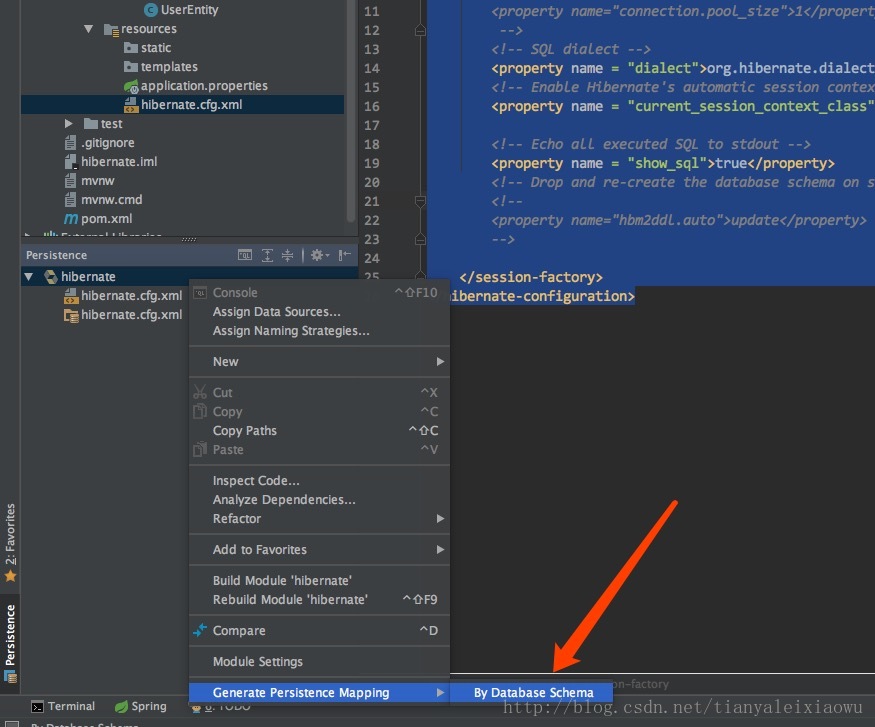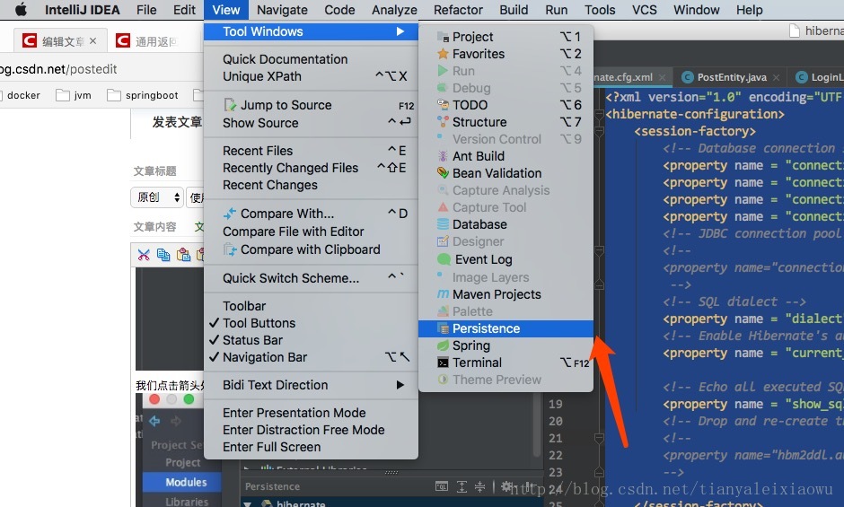 然后点击View-Tool Windows-Persistence,注意,如果没有配置hibernate的话,是没有Persistence这个选项的。