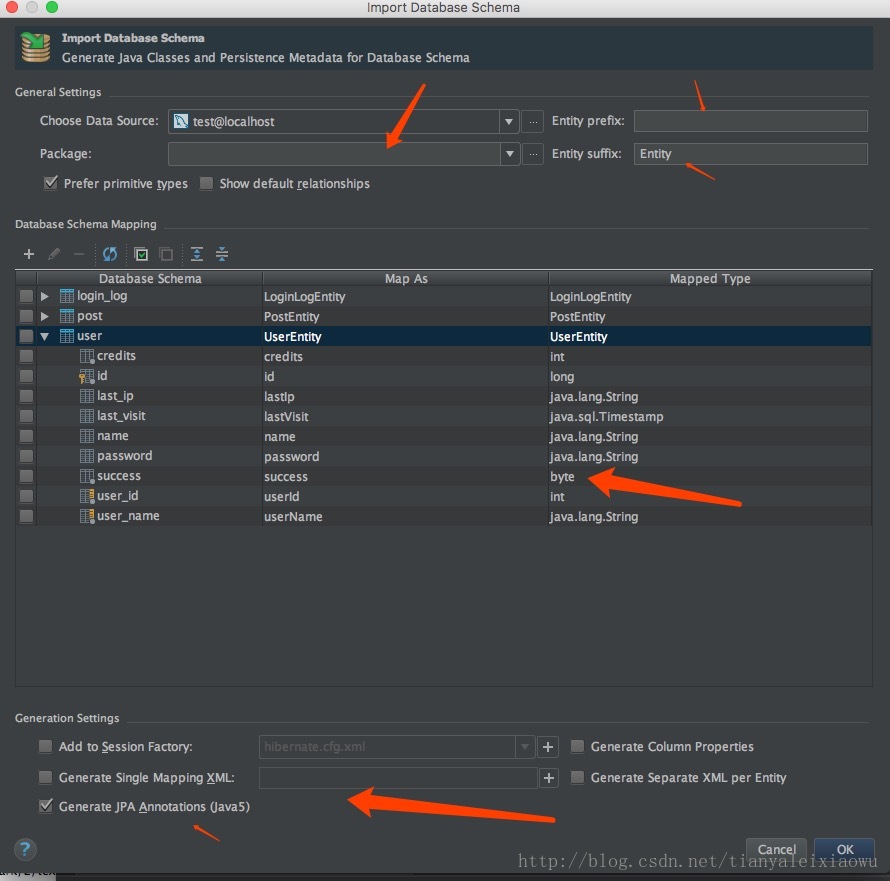 然后就可以设置要生成的类所在的包名,前缀、后缀,还可以修改pojo类的类型,譬如success字段可以修改为boolean,最下面勾选JPA注解。点击OK就行了。