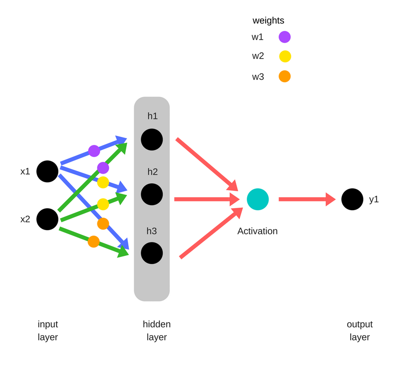 h3 = (x1 * w3) + (x2 * w3) 隐藏层的输出通过非线性函数(激活函数)以形成猜测输出(guessed output)