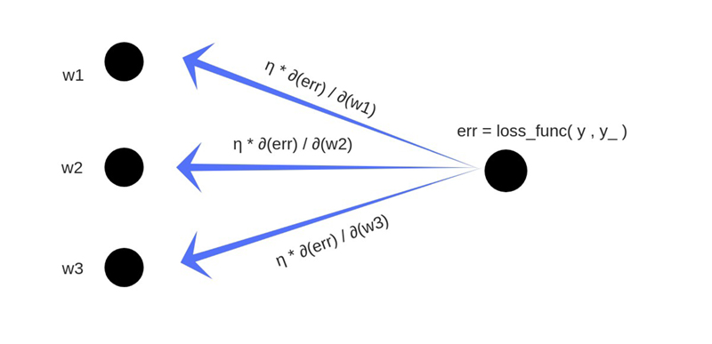 w3 = w3 - (η * ∂(err) / ∂(w3))