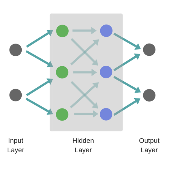 对于两层神经网络,无论绿色隐藏层学习什么,都要传递到蓝色隐藏层,进一步学习(关于绿色层学习)。因此,隐藏层的数量越多,对先前已经学习过的概念的学习就越多。