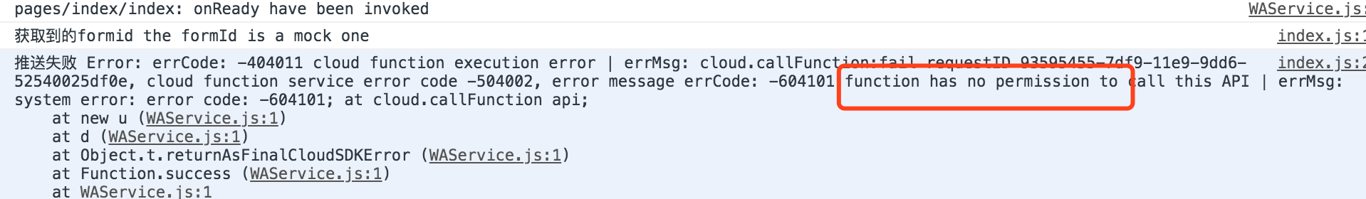 来看下这个错误,看到红色框里的permission就知道,肯定是权限的问题。所以我们在定义完云函数以后,要在push0524云函数下面添加权限配置页面。如下图