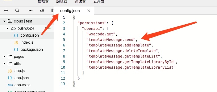 重要的就是这个: “templateMessage.send”, 推送权限。因为推送是云开发给我们提供的,我们这里调用时,必须配置相关权限,才能使用的。