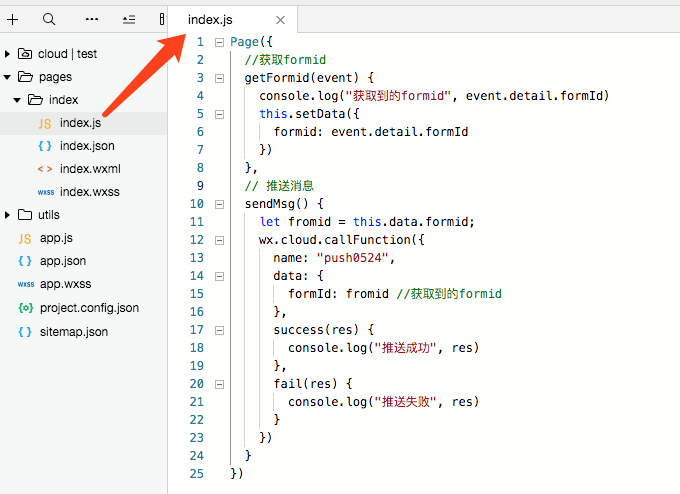 验证其实很简单,和我们之前的《5行代码实现微信小程序模版消息推送 (含推送后台和小程序源码)》 类似。只不过一个是在java后台推送,一个是在小城里推送。下面我们简单写个小程序里验证推送的demo。