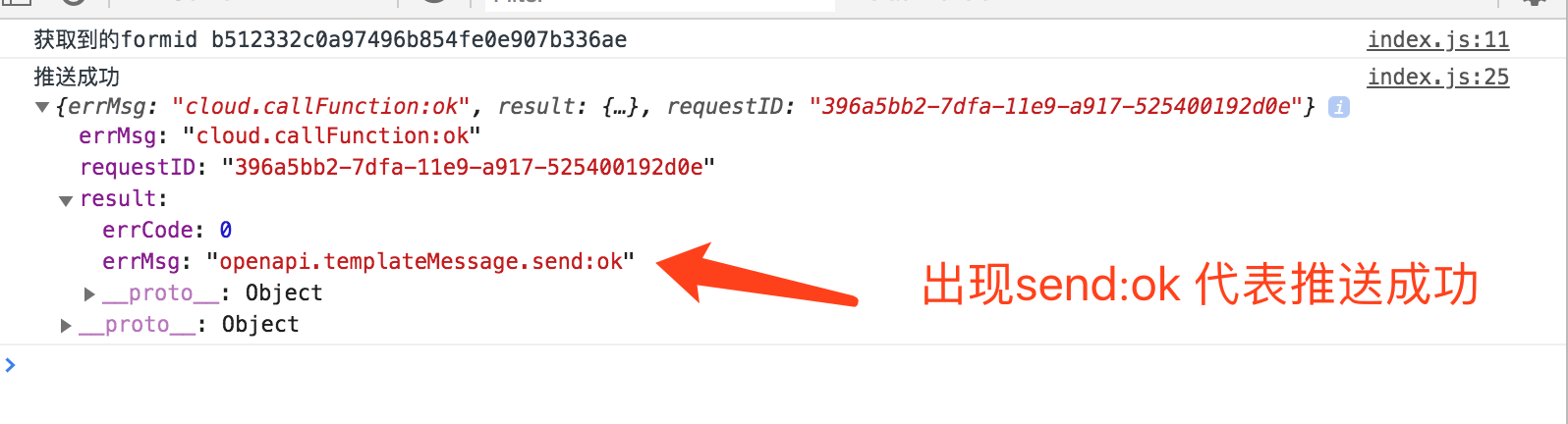 我们在推送成功的success回调中打印下log。如果log中出现,send:ok字样,就代表我们推送成功了。来看下推送成功的效果。