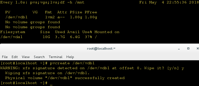 [root@localhost ~]# pvcreate /dev/vdb1 ##创建物理卷/dev/vdb1