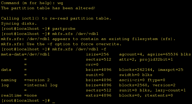 WARNING: xfs signature detected on /dev/vdb1 at offset 0. Wipe it? [y/n] y