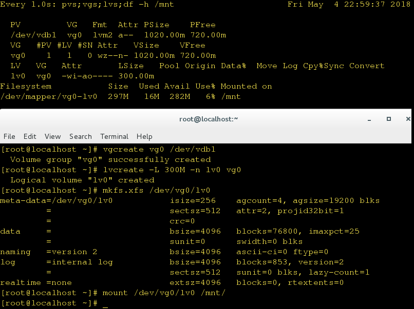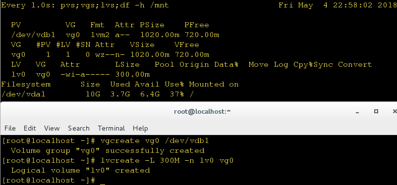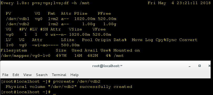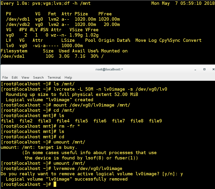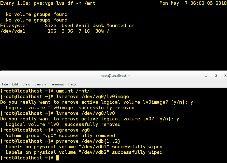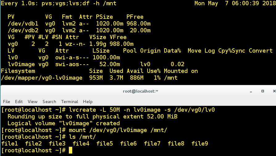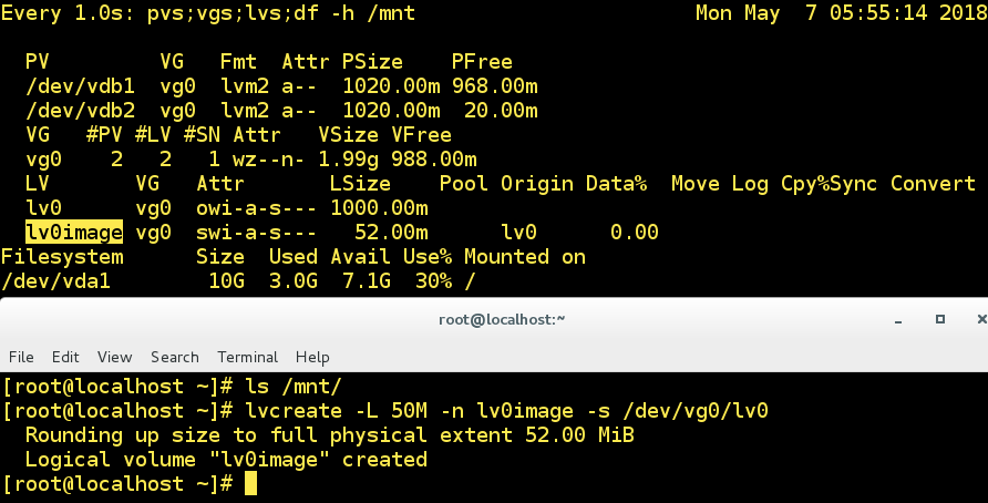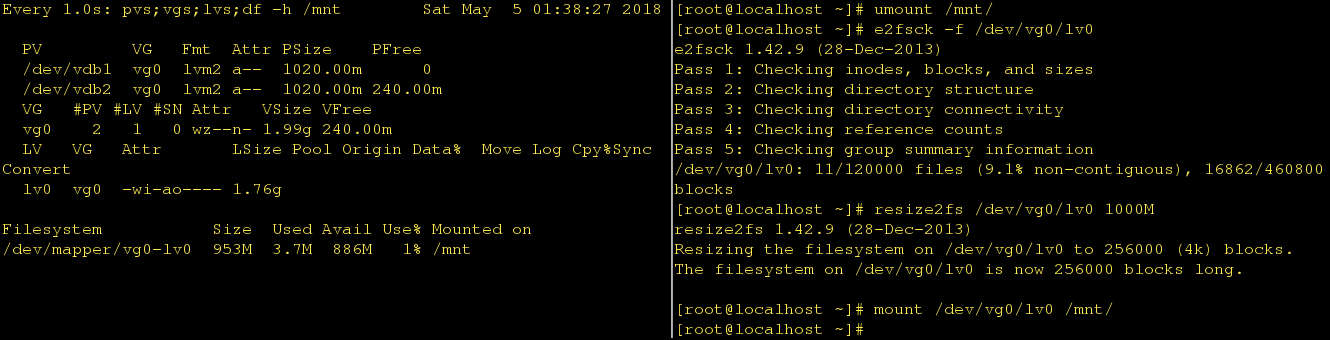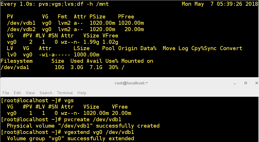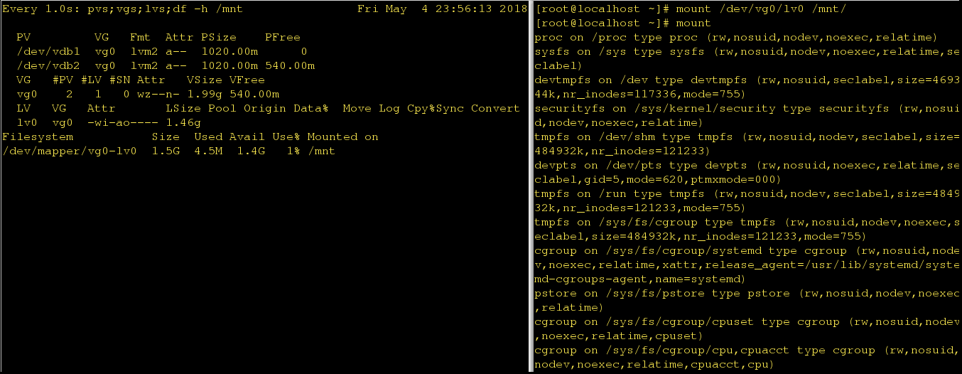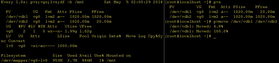 watch -n 1 'pvs;vgs;lvs;df -h /mnt' ##监控命令