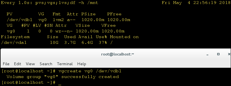 [root@localhost ~]# vgcreate vg0 /dev/vdb1 ##创建了一个名为vg0的卷组,该卷组包含/dev/vdb1一个物理卷