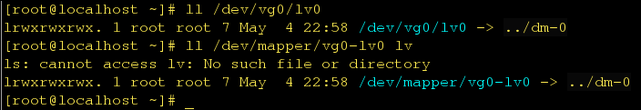 lrwxrwxrwx. 1 root root 7 May 4 22:58 /dev/vg0/lv0 -> ../dm-0