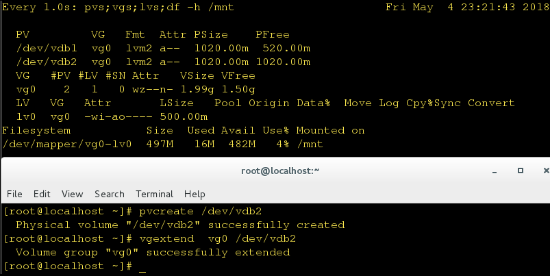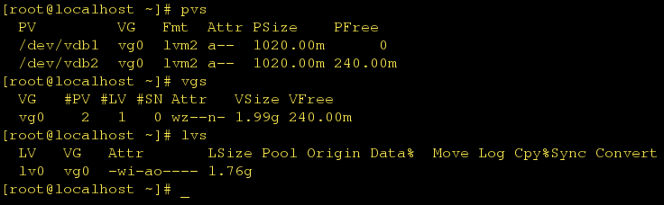 [root@localhost ~]# vgextend vg0 /dev/vdb2
