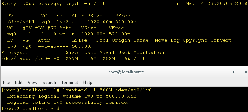 [root@localhost ~]# lvextend -L 500M /dev/vg0/lv0