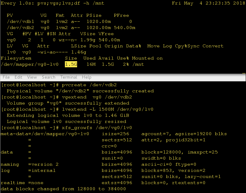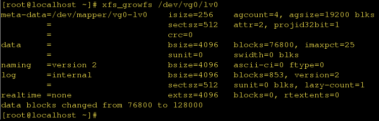 [root@localhost ~]# xfs_growfs /dev/vg0/lv0