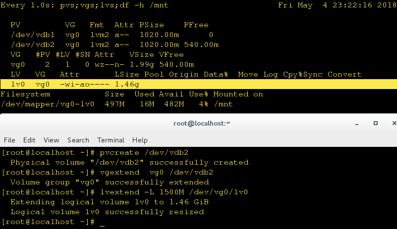 [root@localhost ~]# lvextend -L 1500M /dev/vg0/lv0