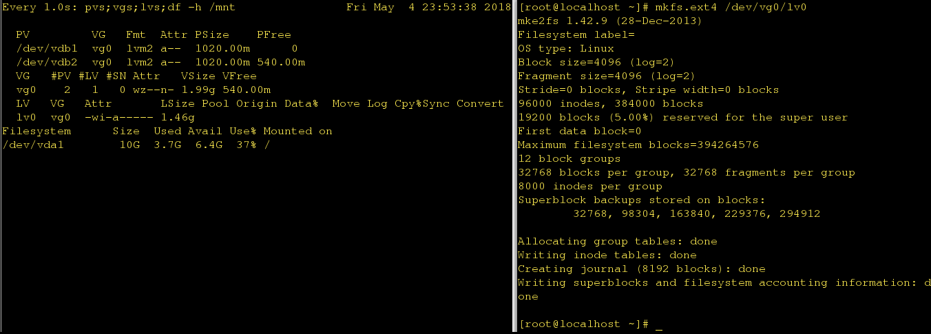 [root@localhost ~]# mkfs.ext4 /dev/vg0/lv0