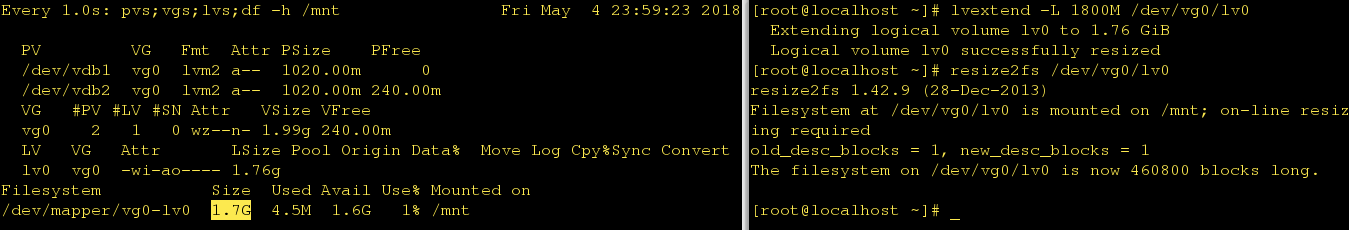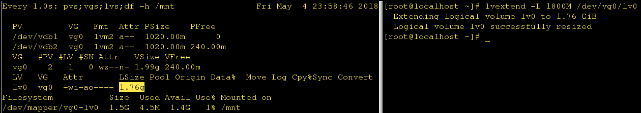 [root@localhost ~]# lvextend -L 1800M /dev/vg0/lv0