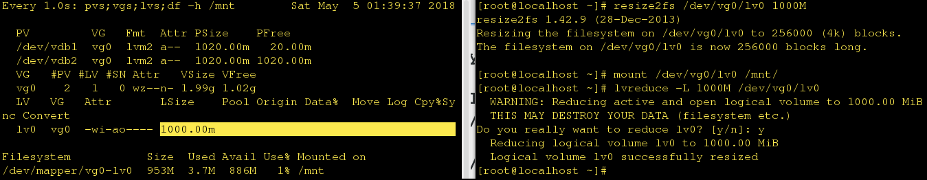 [root@localhost ~]# lvreduce -L 1000M /dev/vg0/lv0