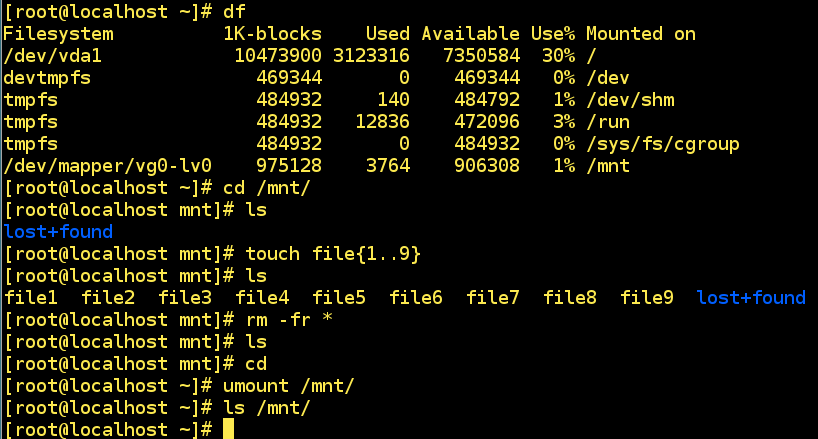 [root@localhost ~]# mount /dev/vg0/lv0 /mnt/