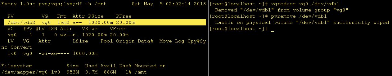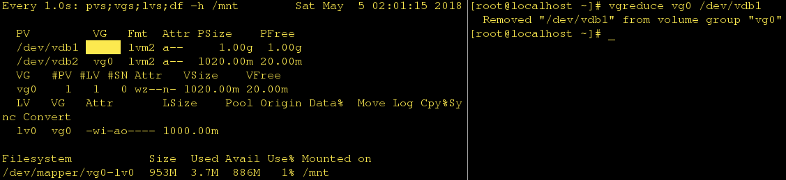 vgreduce vg0 /dev/vdb1 ##将vg0中的/dev/vdb1缩减