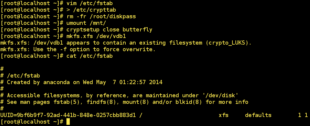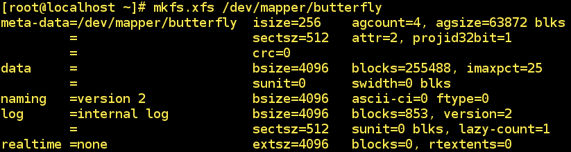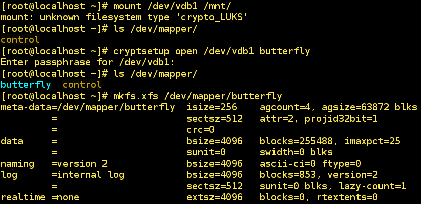 [root@localhost ~]# mkfs.xfs /dev/mapper/butterfly ##将解密后生成的设备butterfly格式化